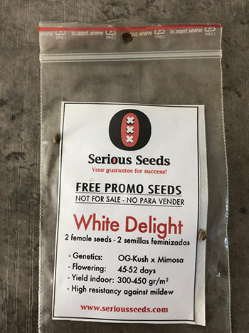 Serious Seeds heeft een nieuwe promo-soort, de White Delight, een kruising tussen Mimosa en OG Kush. Ik ben heel benieuwd naar deze soort. De strain heeft een redelijk korte bloeitijd van 8-9 weken en ga ik voor de eerste keer testen. Daarnaast kies ik ook een klassieke soort van Serious, de Serious Happiness. Deze kruising tussen Warlock en AK-47 is fantastisch! Ze heeft heel veel kristallen en is makkelijk te groeien. Het aroma is zoet en kan soms naar bessen ruiken, verrukkelijk!