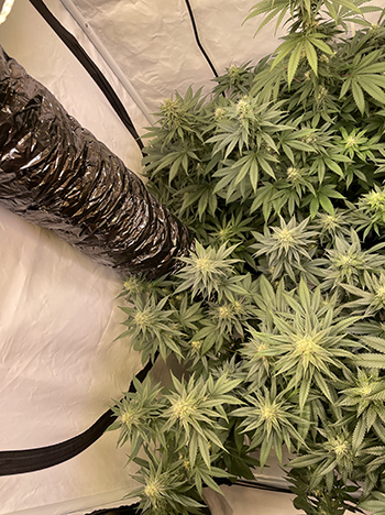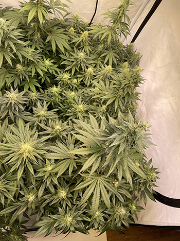 Boven het bladerdek verschijnen dagelijks meer en meer toppen; het is duidelijk te zien dat de bloei nu snel vordert. Uit mijn ’top terps’ genetica groeien planten met heel veel trichomen, en die beginnen nu ook steeds sterker te ruiken. Het zijn hele zoete aroma’s allemaal! Ik verheug me al op al die verschillende lekkere geuren van deze terpenentoppers!