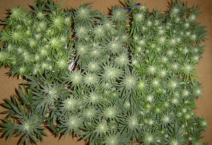 Voor een goede scrog wil je zoveel mogelijk toppen op hetzelfde niveau hebben, zo’n 20 tot 25 centimeter boven de grond. Wanneer ik top, dan neem ik zo’n 12 centimeter van de top weg. Dit doe ik om twee redenen, ten eerste maak ik stekjes van de top, maar de twede reden is wat ingewikkelder. De theorie is dat een plant een bepaalde hoeveelheid wortels moet hebben om een bepaalde hoeveelheid bovengrondse groei te kunnen maken. Wanneer ik dus boven de grond een kwart van de plant weghaal, zal de plant zich vervolgens alleen bezighouden met de bovengrondse groei in plaats van de wortelgroei. Wanneer ik dan dus top zal de groei in de bovenkant even stilstaan waardoor de rest van de takken kunnen bijgroeien. En dit is precies het soort groei wat ik wil om het rek te kunnen vullen.