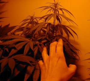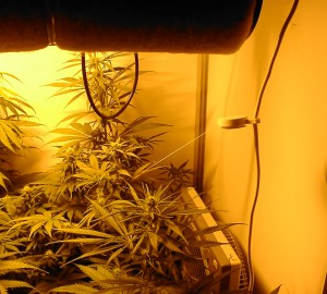 Omdat mijn planten ook nog steeds in de hoogte groeien wordt de ruimte in mijn G-Tools kast nu een beetje krap. De lamp hangt al zo hoog als mogelijk is, en sommige toppen groeien daar al naar toe. Omdat het direct onder de lamp te heet is voor de plant (van een 600 W lamp moet je minimum 60 centimeter afstand houden) moest ik een van de planten supercroppen en een andere met behulp van een YO-YO (verkrijgbaar in iedere growshop) naar de zijkant trekken zodat de stam niet meer zo dicht op de lamp groeit.
