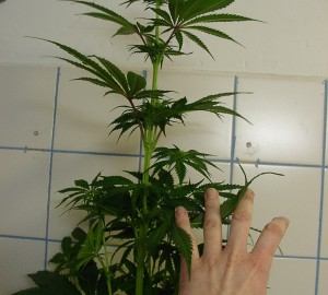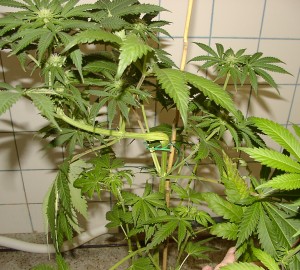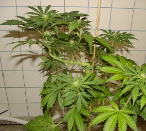 Deze 90 centimeter grote plant heb ik gesupercropped. Dat betekent: de hoofdstam gewoon op 20 cm onder de top van de plant indrukken rondom en dan de hele stam ombuigen tot hij naar beneden kijkt. Daardoor gaan de zijtakken sterker groeien omdat de hoofdtak zich eerst weer moet herstellen. Daarmee voorkom je dat de plant veel te hoog wordt. Je verliest de hoofdtop er bovendien niet mee. Dat in tegenstelling tot bij het toppen (=hoofdstam afsnijden onder de bovenste internode). Inmiddels heeft de hoofdtak zich weer prachtig hersteld en is in een boog weer naar boven gegroeid.