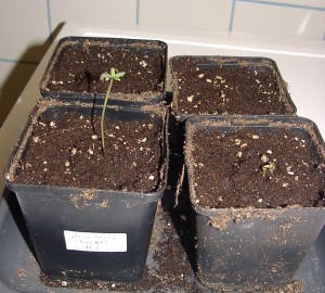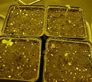 Ik heb de ontkiemde zaadjes onder een 600 Watt HPS (=hoge druk natriumlamp) gezet, welke op 75% gedimd was middels de dimbare ballast. De lamp hing op ongeveer 100 cm boven de potjes, om ervoor te zorgen dat ze niet uitdrogen door de hitte. Dat was eigenlijk een beetje te hoog, en mijn zaailingen zijn daardoor dan ook een beetje gaan strekken. Dat doen ze omdat ze naar het hoog hangende licht willen groeien.
