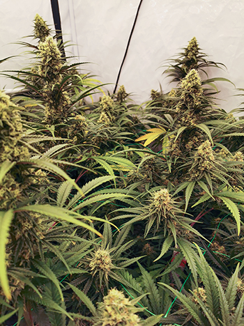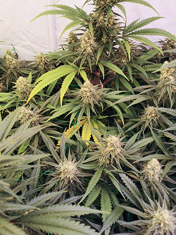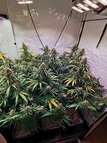 Aan het begin van week 8 (de zesde week van de bloeifase) krijgen sommigen van de 18 Cannalope Haze planten gele bladeren, wat laat zien dat ze zo langzamerhand rijp aan het worden zijn voor de oogst. De planten hebben inmiddels ook reusachtige cola’s van toppen, en produceren iedere dag nog steeds nieuwe bloemen, het is fantastisch om te zien!