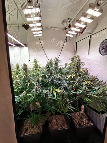De Lumatek aan de linkerkant hangt nog steeds op 50 centimeter afstand boven de toppen van de planten en brandt ongedimd op 100%, dus op vol vermogen. De twee SANlights hangen op 60 centimeter afstand en zijn nog steeds gedimd op 80% van hun maximale vermogen.