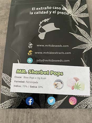 Mr. Sherbet-Pops komt ook in m’n tent. Dit is een nieuwe soort van Mr. Hide Seeds uit Spanje. Dit relatief kleine zadenbedrijf maakt kruisingen tussen heel erg lekkere soorten, en van de Sherbet-Pops kreeg ik een gratis pakje op Spannabis in Barcelona.