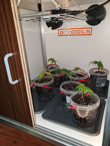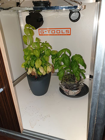 Ik heb de stekjes in de welbekende tomatenemmertjes gestopt en in mijn andere CNNBS G-kit geplaatst. Omdat de testplant (van twee basilicum plantjes – de ene onder de Hans Panel en de ander voor het raam) onder het Hans Panel verder is vergeeld, gebruik ik daar de geleende Hans Panel (zie deze eerdere kweekupdate). Deze heb ik op de groeistand gezet, zodat de stekken rustig verder kunnen groeien.