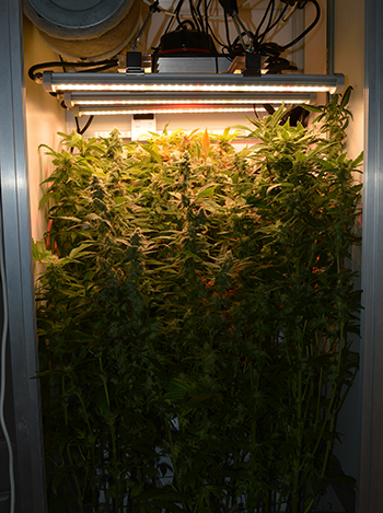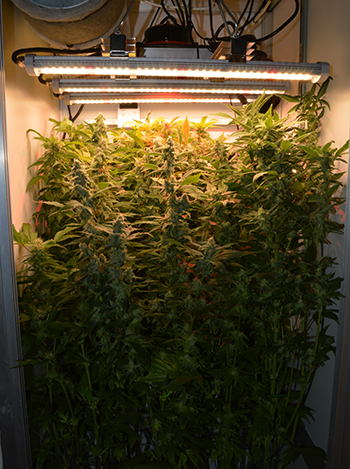 De vijf 24k Gold planten die ik binnen in mijn kweekkast heb, staan na deze week zes weken zichtbaar te bloeien. Ik heb ze ettelijke keren ontbladerd met een overvolle CNNBS G-Kit tot gevolg. Inmiddels is het nu eigenlijk een kwestie van wachten tot de toppen klaar zijn om geoogst te worden. Het liefst zou ik hier en daar nog wel wat meer bladeren willen weghalen, ware het niet dat die inmiddels onbereikbaar zijn geworden.