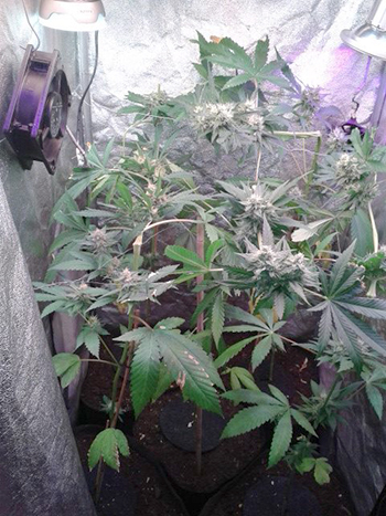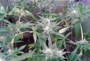 Je kunt zien dat de planten in een soort vierkant groeien, het lijkt bijna alsof ze gescrogt zijn. Dat is niet het geval, maar omdat de planten maar bleven strekken moest ik ingrijpen. Ik heb ze daarom gesupercropped. Supercroppen is een methode waarbij je de stammen tussen je vingers een beetje kneust, zodat je deze plat kunt leggen. Het is wat anders als scroggen maar je kunt het wel op ieder moment toepassen, al is het beter om het in de groeifase te doen. Supercroppen is een goede manier om in het geval dat je planten te hoog worden, ze op het laatste moment toch weer kleiner te krijgen.