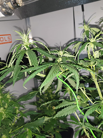 Deze week staan de wietplanten te dansen voor de camera’s. Ik heb de top van de Critical Orange Punch om moeten buigen en hier is het herstel bijna goed te zien. Jammer genoeg viel het niet helemaal binnen het zicht van de cameralens.