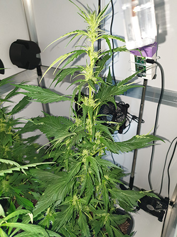 De eerste Frisian Duck is inmiddels 53 centimeter hoog. De meeste van haar bloemen vallen weg onder het duck foot blad. De duckies ruiken nog niet zo sterk als de Critical Orange Punch.