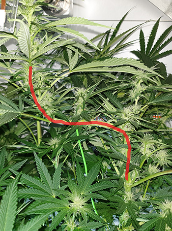 Op de foto rechts in het rood aangegeven, zie je de zijtak van de Mohammed op een foto van vorige week. Deze morgen stond die tegen de 315 Watt CMH lamp aan. Oh Willie Wietman, pas toch op! Gelukkig is er niets in de verbrand en is de betreffende top nog heel. Deze heb ik meteen maar even op gelijke hoogte geknipt met de rest. Dus Willie Wietman wat heb je nou geleerd? Elke dag even bij de plantjes kijken Ome Willem.