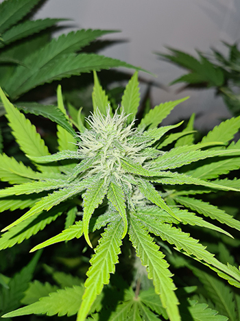 Tijdens het maken van de foto’s kwam ik er ook achter dat ik één Mohammed heb die afwijkt van de rest. De plant trok mijn aandacht omdat ze niet zo schitterde als de andere dames. Ze staat in het midden vooraan, bijna recht onder de 315 Watt CMH binnenzon. Het is een van de planten die vanuit een zaadje is groot gebracht.