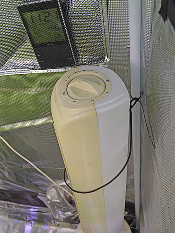 Twee planten tikken de lamp al aan maar ik wacht altijd een paar dagen met het verhogen van de lamp. Zo hou ik ze een beetje in toom want anders is ook deze tent nog te klein. Op de foto kun je zien dat ik een borgtouwtje om mijn ventilator heb gedaan, dit doe ik voor zodat ik hem niet per ongeluk om kan stoten. Dat heb ik al een keer meegemaakt en das niet leuk.