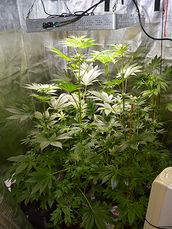 Barney geniet met een heerlijke joint van smooth jazz tunes op deze cannabis-feestdag. Zijn planten – Sour Tangerine, Serious Happiness en CBD Medi Kush – staan alweer vier weken op 12/12 en beginnen hun toppen te vormen. Barney, kom d’r maar in!