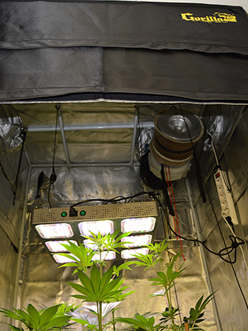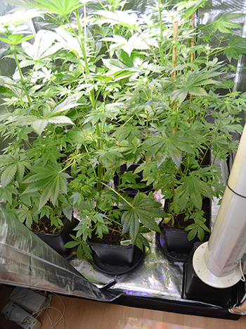 Aan het begin van deze ronde had ik de potten midden in de tent, strak tegen elkaar staan. Dat deed ik omdat ik hoopte dat het licht via de zijwanden ook de lagere takken van de planten zou bereiken. Nu heb ik de planten wat meer over de oppervlakte verdeeld zodat het licht in het midden wat verder door kan dringen. Ik hou ze nog wel een stukje van de kant af, anders komen delen van de planten zonder licht en das jammer.