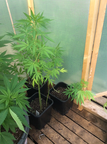 Drie autoflowers, links en recht de niet en wel getopte Auto BrooklynSunrise met in het midden de Blue Invader