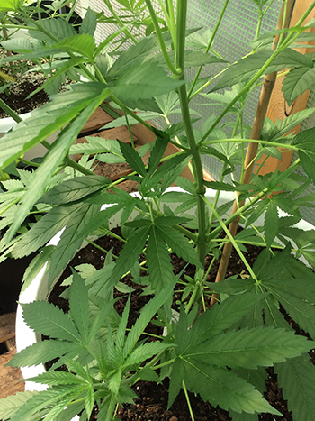 Tijdens de vele momenten waarbij we niet meer konden doen dan observeren met een gare grijns op onze smoelen, hebben we de nodige filosofie op de vegetatie losgelaten. Wat ons het meest opviel is de reactie op verschillende bondage technieken. De bladeren zoeken nog steeds het zonlicht op met hun bladvingers. De lengte van de planten en het aantal bladeren blijkt in onze vergelijking exact hetzelfde, alleen is de afgebonden dame een stuk donkerder van kleur en vertoont ze tekenen van verstikking door het visdraad. Nogmaals: dit was vooral om de verschillen te meten. Deze dames gaan de volle grond in en zullen laten zien wat de verschillende technieken met hen hebben gedaan en hoe ze zich aanpassen aan hun nieuwe omgeving.
