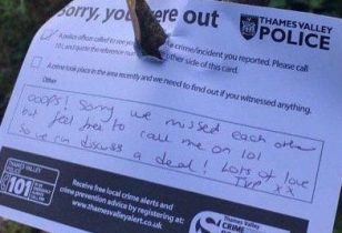 Dat is gewoon niet leuk. Zelfs niet als het in Groot-Brittannië is, waar ze zoals gezegd de beste humor bezitten. Maar oordeel vooral zelf of onderstaand briefje grappig is als de flikken net al je wietplanten hebben meegenomen: