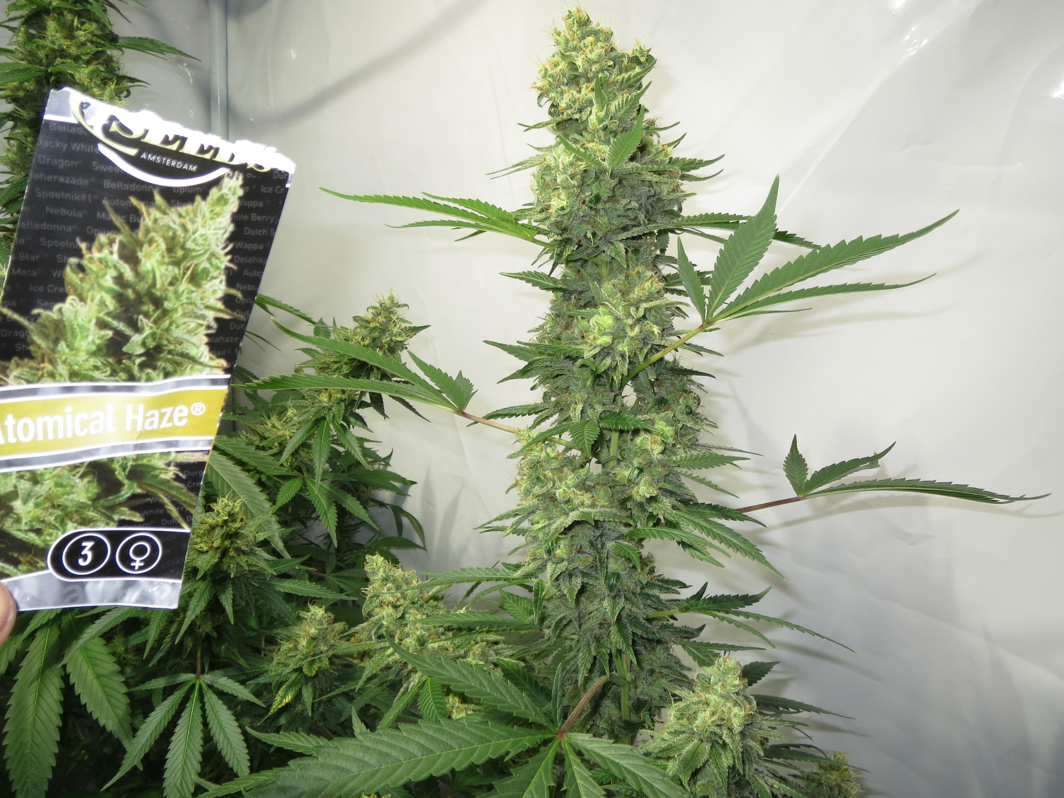 Wie wat minder haast heeft kan zijn of haar kweektent trouwens prima tot de nok toe vullen met slechts een of twee Atomical Haze dames en enige subtiele training. maar wat je kweekmethode ook is; aan het einde van haar leven zit de gemiddelde Atomical Haze plant vol met mooie grote plakkerige toppen. Toppen met een blad-budverhouding waar knippers een gat van in de lucht zullen springen, die je bij wijze van spreken als rijpe peren van de planten plukt. In ons klimaat is Atomical Haze geen echte buitenplant, maar wie bijvoorbeeld een jaartje in Spanje woont of in een andere zuidelijke streek kan met deze soort rekenen op planten van monsterformaat die door haar sativagenen ook goed bestand zijn tegen schimmels.