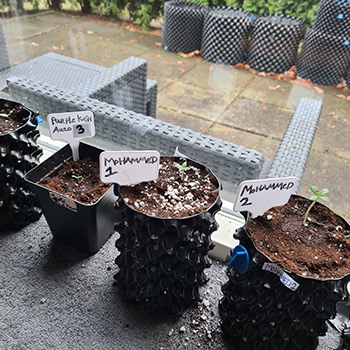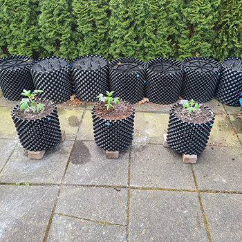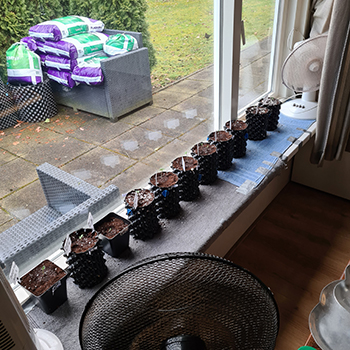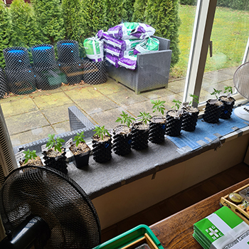 Vanwege het 20L Air-Pot formaat is het geen mogelijkheid om deze potten, in drievoud achter het raam te zetten. Dus moeten de plantjes nu al naar buiten. Daarbij is het dan wel een mooie bijkomstigheid dat ze ook UV straling mee zullen krijgen van de zon, want achter het raam is die straling er helemaal niet of in het gunstigste geval nog steeds erg schaars. Elk raam en zeker dubbelglas filtert UV-licht (grotendeels) weg. Zogezegd, zo gedaan en wel op 12 april. Nu maar hopen dat alles goed gaat.