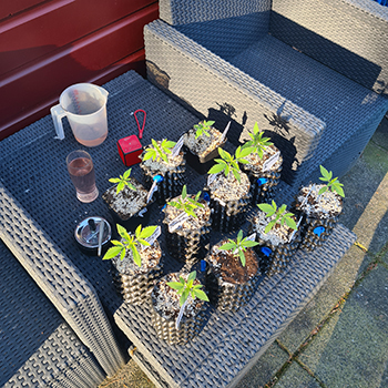 De autoflowers heb ik noodgedwongen al verpot en gaan met enige tegenzin nu al naar buiten! Op het moment van schrijven zitten we in de zesde week, en dat betekent dat de autoflowers ook al kunnen gaan bloeien! Het is hierom, dat ik mijn drie autoflowers met enige tegenzin moest verpotten en naar buiten gezet heb. Ik wil de dames namelijk NIET verpotten wanneer ze al in bloei staan, en ik wil ze ook niet in deze kleine potjes laten afbloeien. Er zijn zeker kwekers die mooie resultaten met kleine potjes behalen, maar dan praten we vaak over een geoptimaliseerde binnenkeek met een professionele kweeklamp en alles erop en eraan.