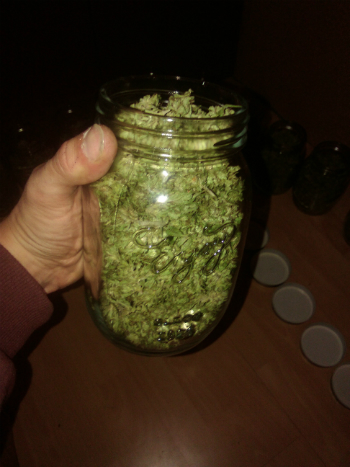 Als je een hoop toppen hebt getrimd, weet je natuurlijk dat je met een hoop knipafval zit, en ik ook dus. Maar liefst 750 gram knipafval om precies te zijn. Hiervan zal ik, wanneer deze goed droog is, ice-o-lator hasj, hasjolie, en lekkere spacecake van maken. Maar eerst is het tijd voor een groot oogstfeest met mijn vrienden!