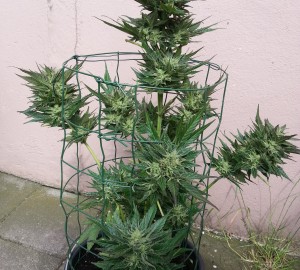 De grootsten van al mijn planten staan in de volle grond. Het zijn de Passion #1 en de Frisian Dew van Dutch Passion Seeds. Ik heb deze dames in een scrog gezet omdat ik niet wil dat ze heel hoog worden. Het is alleen zo dat ze op dit moment al zowat het hele scrog rek bedekken, en er al bijna geen plek meer is om ze omlaag te binden. Ik zit daarom over te denken om alle toppen te toppen. Als alles goed blijft gaan met deze planten, zal ik er heel veel wiet van oogsten, het beloofd echt wat moois te worden.