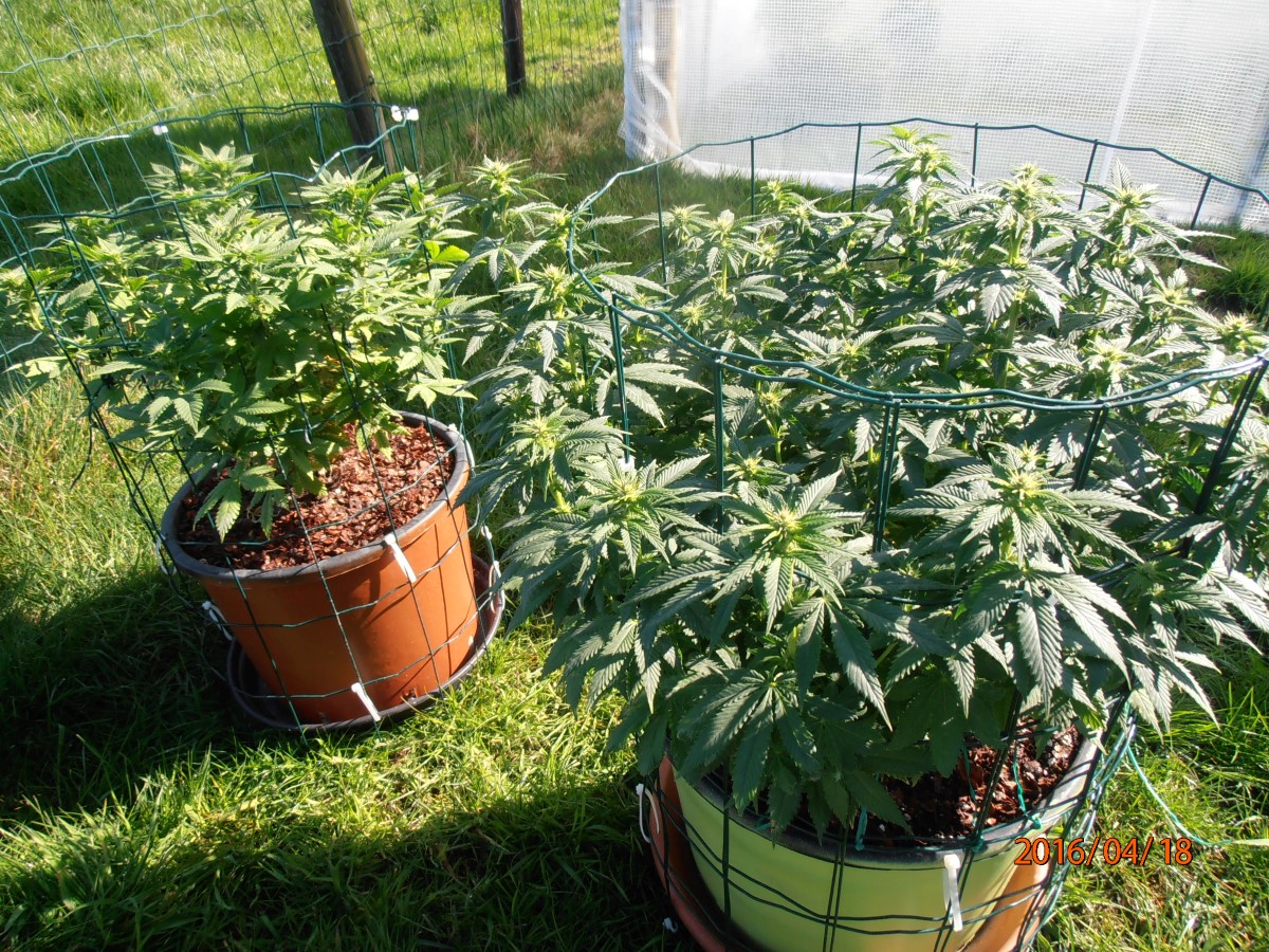 De planten zien er wel oké uit. De grotere potten krijgen één keer per week water, de kleinere om de 3 dagen. De oudste planten staan nu 4,5 weken in bloei. Er zijn kleine topjes gevormd en ook de harsproductie komt op gang. Of het echt dikke toppen worden valt nog af te wachten. Zoals het er nu uitziet zal er ook redelijk wat blad tussen zitten. Op zonnige dagen mochten de planten onder de volle zon staan, al bij al was dit de laatste 2 weken slechts 3 dagen het geval. Omdat ze dus nog niet veel in de wind gestaan hebben vrees ik een beetje voor zwakkere stammen.