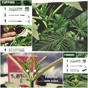 Nu raad je het dus al, we gaan die apicale dominantie of ‘top dominantie’ van de plant tegen zichzelf gebruiken om onze opbrengst te verhogen. Toppen of fimmen zijn twee methodes die in principe – mits goed en tijdens de groeifase uitgevoerd – bijna niet fout kunnen gaan. In het ergste geval krijg je alsnog één top i.p.v. de gewenste verdubbeling en soms zelfs een verviervoudiging van zijtakken en toppen. Nu dus de vraag wat is toppen en wat is FIM(men)? Zie de afbeeldingen voor meer duidelijkheid.