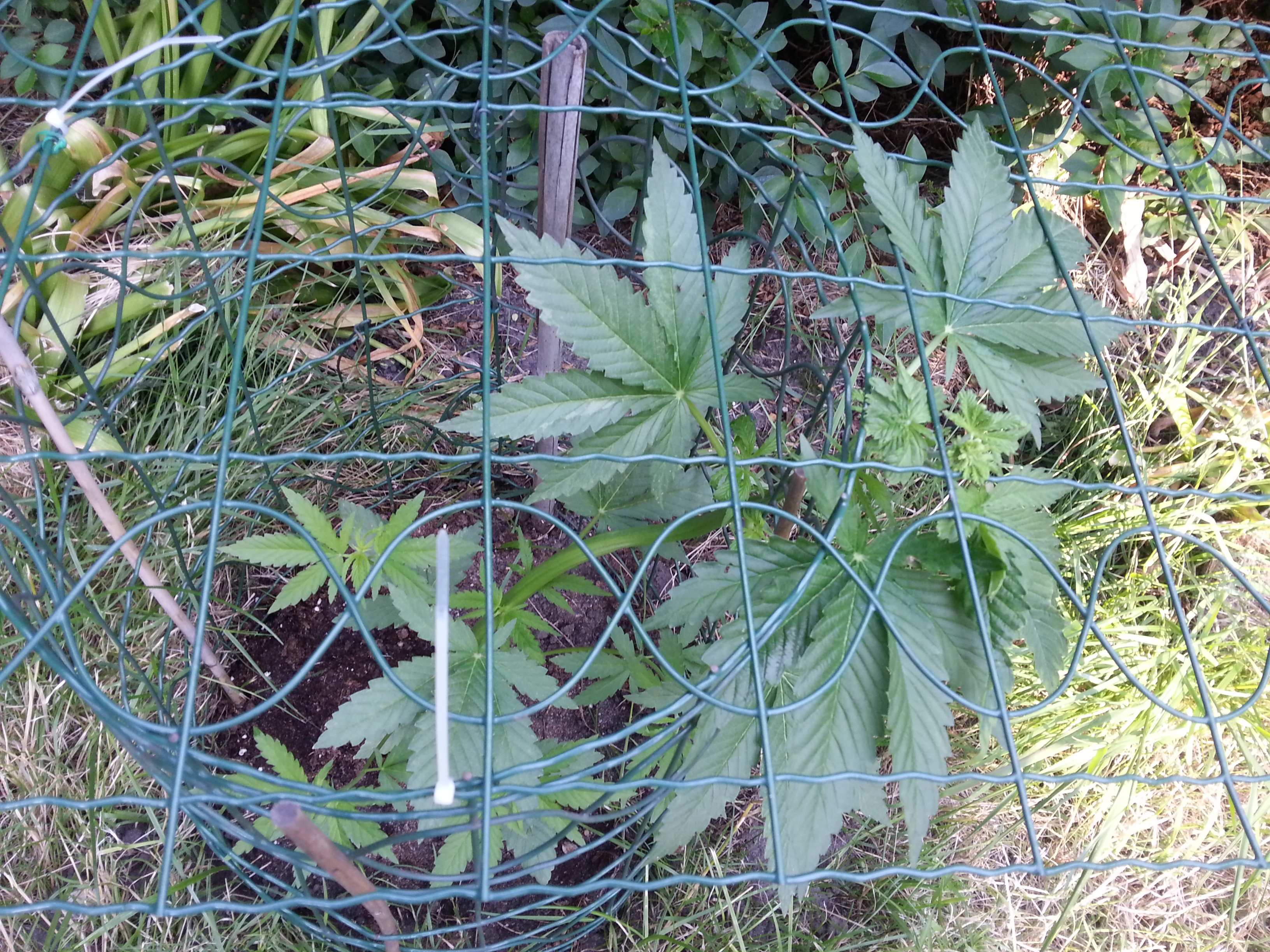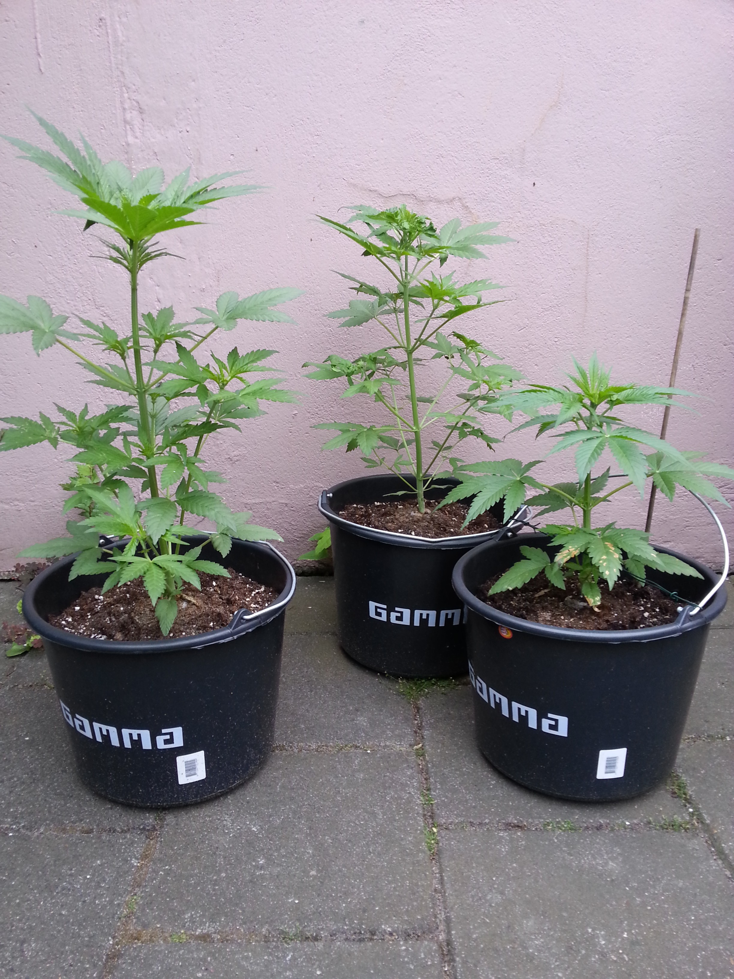 Het gaat lekker aan het buitenwietfront, waren de planten vorige week nog best klein, nu zijn de dames van onze buitenwiet correspondent al zo’n 60 cm hoog. Alleen de Early Skunk blijft jammer genoeg wat achter, maar dat is geen autoflower, en dus heeft ze nog tijd zat om bij te trekken.