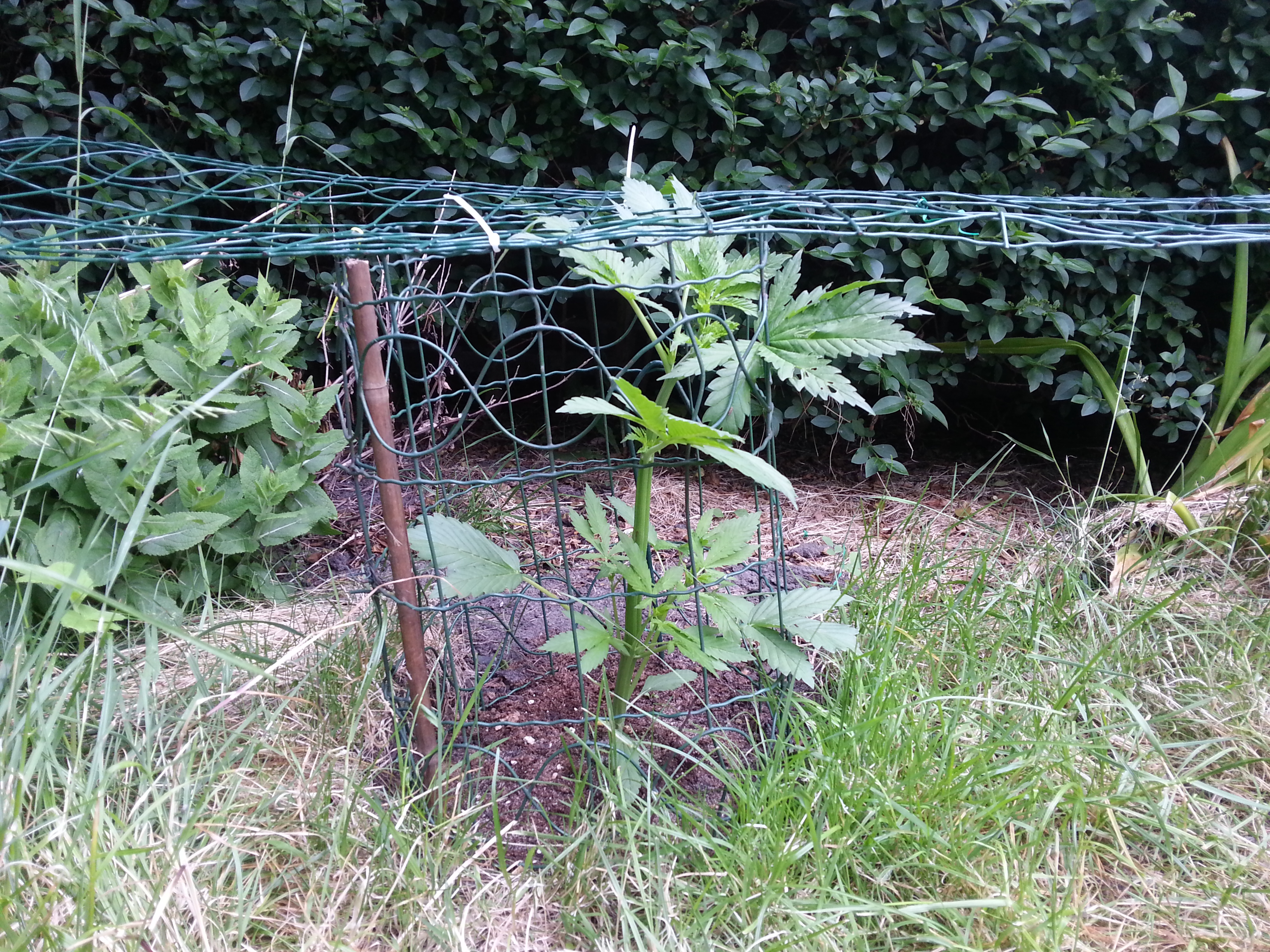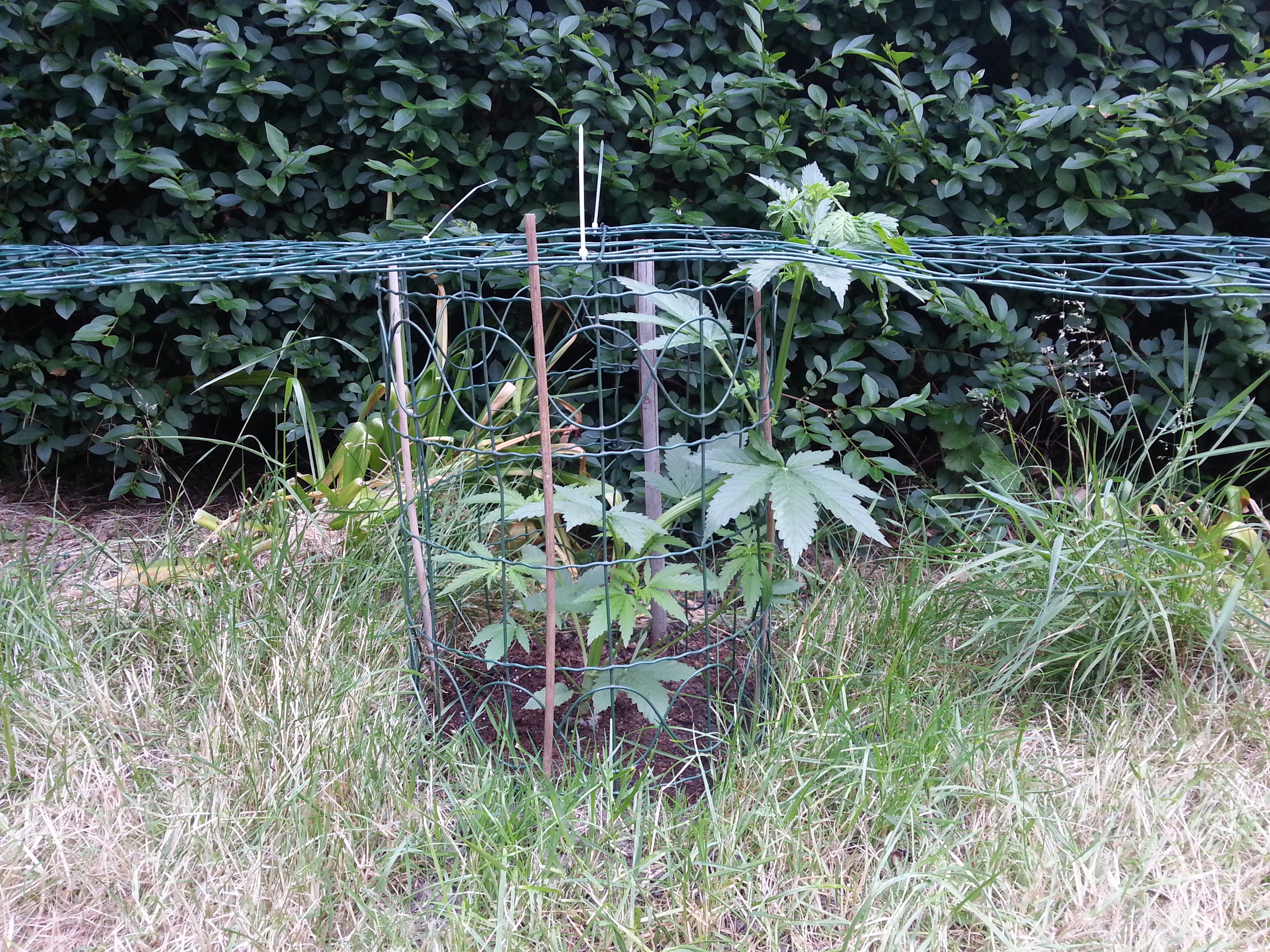 En dan over naar de achterkant van mijn tuin, daar staan de Passion #1 en de Frisian Dew namelijk heerlijk in de volle grond. Vooral de Passion #1 groeit lekker door en komt al boven het beschermende hekje uit. Ik heb haar daarom een stukje naar rechts geleid en een scrog rek aangebracht. Zoals ik vorige week al zei wil ik niet dat mijn planten boven de heg uitgroeien en daarom ga ik ze deze zomer lekker laag houden door te scroggen. Zo blijven ze lekker laag en krijgen alle toppen straks lekker veel zon. Ik hoop op een mooie oogst van deze twee dames.