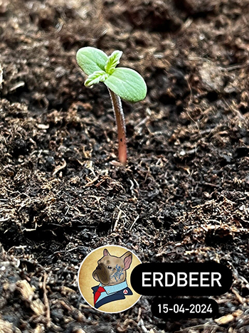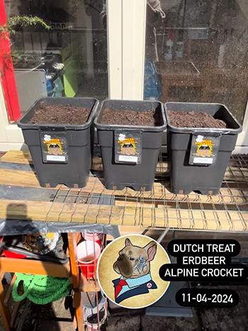 Twee dagen later (10-4) waren de Erdbeer en de Alpine Crocket al ontkiemd, terwijl de Dutch Treat nog even op zich liet wachten. De drie vierkante potten van 11 liter heb ik met recyclede Plagron grond gevuld, die ik met perlite gemixt heb. Ook heb ik Biotabs Bactrex, Biotabs Silicium Flash, Biotabs Mycotrex en Biotabs voedingstabletten gebruikt.