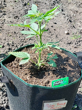 De locatie van de lichtgevoelige Alpine Honey Melon en Big Yeti heb ik moeten verplaatsen van de volle grond naar een kweekzak van 20 liter. Dit is helaas ook in verband met de allesvernietigende slakkenterreur.