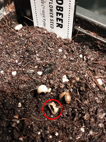 Update 30 mei 2024: Hallo CNNBS, lezers en medegrowers! Een week verder dus een kleine update. Alpine Crocket en Erdbeer heb ik al in een klein potje kunnen stoppen, en zijn inmiddels bovengekomen. Erdbeertje had hierbij erg veel last van het vliesje, dus heb ik na een dag toch maar geholpen. Ze ziet nog wat witjes maar ik denk dat dat wel goed komt. Op de foto zie je het vliesje omcirkeld. Ik verwen ze nog even een paar dagen binnen onder de lamp, op een verwarmde mat.