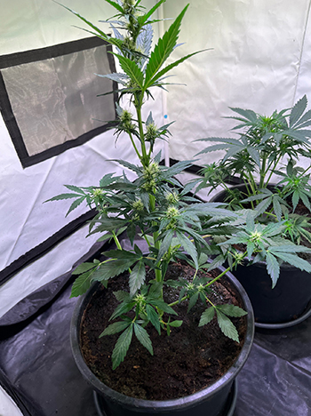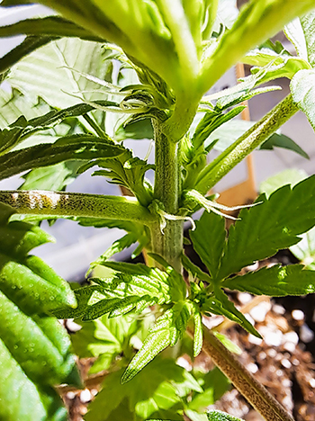 De Alpine Crocket, Erdbeer en Dutch Treat strekten behoorlijk door het beperkte licht. Ik was even bang dat ze zouden omvallen, zulke lange slungels waren het geworden! Omdat ik twijfelde over de beste manier om ze te ondersteunen (ze staan al in de eindpotten dus dieper ingraven was geen optie), mailde ik de redactie voor advies. Sanne van de CNNBS redactie tipte me om voor een licht briesje te zorgen, zodat de stammen wat sterker worden. Dat heb ik een paar dagen gedaan met een clipfan, en dat heeft goed geholpen. Vooral de laatste dagen worden de kleine stammetjes steeds dikker en de blaadjes groter en steviger .