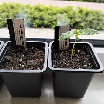 Update 6 juni 2024: Hallo liefhebbers, weer een weekje verder zijn de rollen omgedraaid. Met Erdbeer gaat het nu goed en met de Alpine Crocket gaat het juist wat minder. De lobblaadjes zijn beschadigd, en daardoor groeien de eerste twee echte blaadjes langzaam. Door deze vertraging heb ik besloten de lichtgevoelige zaden alvast te ontkiemen.