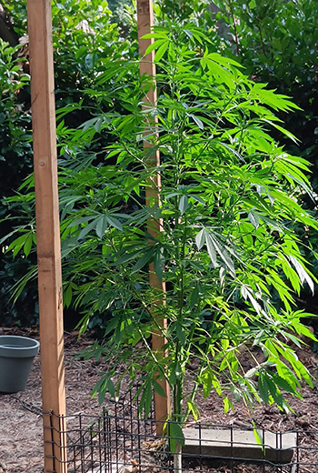 Update 30 juli 2022: Ruim 3 maanden na het zaaien staan de dames gezusterlijk met zijn vieren bij elkaar. In mijn laatste update had ik me vergist, het is natuurlijk nummer #3 die zo hard gaat, inmiddels 2,90 meter hoog. Nummer #5 is juist de zwakste, kan niet zo goed tegen wind en regen, hopelijk redt ze het komende herfst. Nummer #2 in de kuip heeft een groeistop en haar schutbladeren zijn aan het vergelen, ik probeer nog wel wat bij te voeden, maar ’t mag niet echt baten. Nummer #4 gaat prima, is 2,20 meter hoog en kerngezond. Hier een overzichtsfoto.