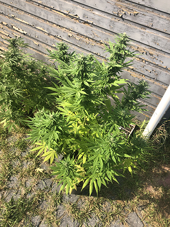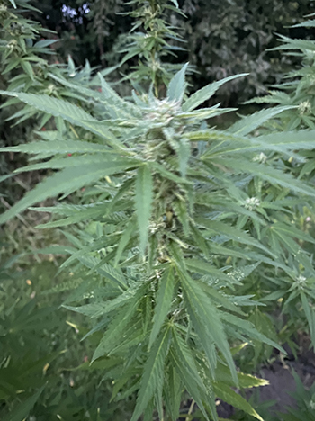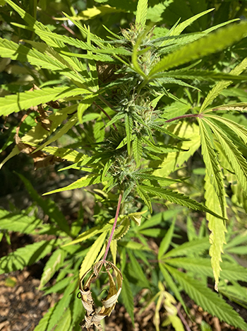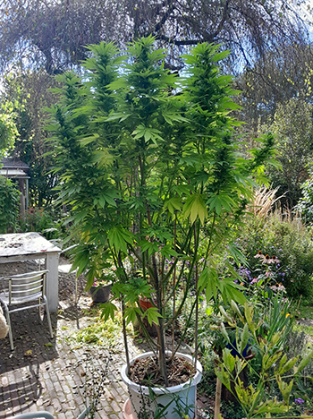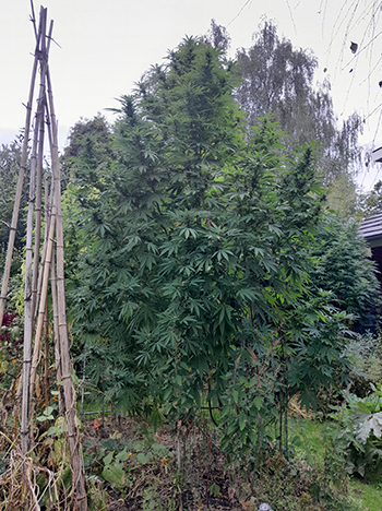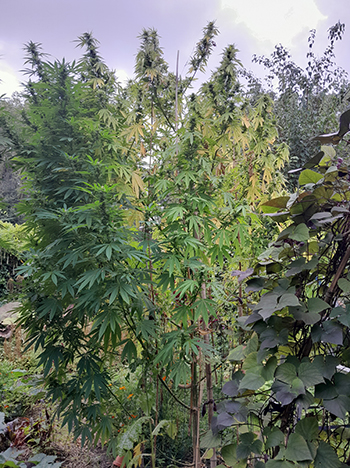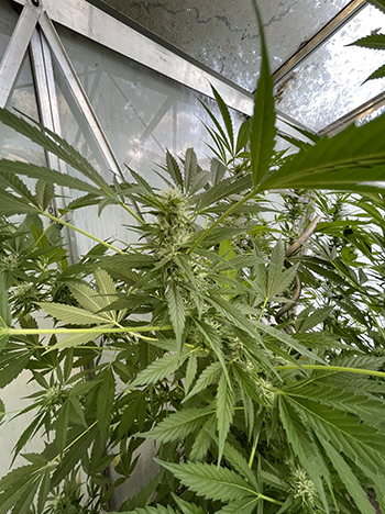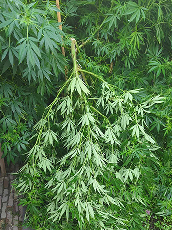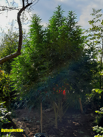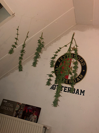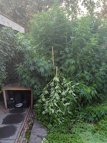 Er zitten nog maar zeven takken aan de plant maar daardoor krijgt de achtergelegen Dynamite wel weer wat meer licht en lucht. Ik heb de takken die zijn afgebroken toch maar te drogen gehangen; ze ruiken al goed en plakken ook. Ga gewoon proberen er olie van te maken, we zullen zien; een nieuw experiment.