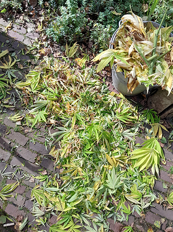 Update 13 september 2023: Eerst maar even het wat mindere nieuws… Het knippen is noodgedwongen begonnen. Ondanks het werkelijk ongelofelijk fantastische weer, heeft (opmerkelijk genoeg slechts een deel van) de Double Bubble haar eindstadium bereikt. Al het blad is vergeeld en zelfs deels bruin vanuit de bladpunten. Ik heb het sterke vermoeden dat de extreme zomerregens de boosdoener zijn, en dat een deel van het wortelstelsel rot is. Ik had afgelopen week al wat toprot ontdekt en verwijderd, maar nu kon ik dus echt niet langer wachten.