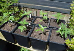 Het is maar goed dat ik de autoflowers meteen in grote potten gezet heb, anders zouden ze weleens voortijdig kunnen gaan bloeien (en daardoor erg klein blijven). Ik heb de drie lichtgevoelige zaailingen afgelopen zondag wel verpot, op een van de schaarse zonnige dagen van afgelopen week.