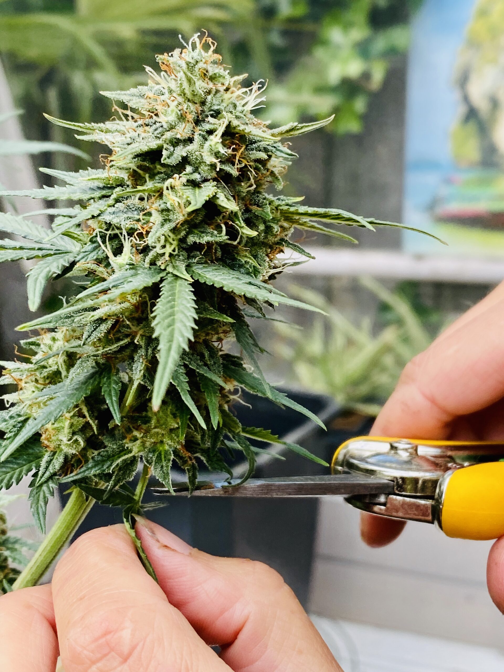 Toen vervolgens ook opviel dat er weinig extra zwelling meer in de bloemen leek te komen, heeft de zak-microscoop onthuld dat een kwart van de trichomen reeds amber van kleur was. De hoogste tijd om te oogsten dus, terwijl ik eigenlijk nog wat groei in de toppen voorzag.