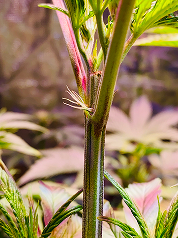 Hoewel ik nog niet eerder stekken heb mogen nemen van de cannabisplant, besef ik terdege dat ik deze in verband met hormonale veranderingen dien te nemen, vóórdat ze in bloei gaan. Het nadeel daarvan is dat ik genoodzaakt ben een aantal stekken in een later stadium weer te verwijderen, zodra het geslacht van de moederplant bekend is. Net zoals bij het elimineren van de volwassen mannelijke planten voelt dit toch enigszins als verloren energie. Maar nu lijkt echter een ander opmerkelijk feit daar een positieve verandering in te brengen. Nog niet eerder ontwaarde ik al in zo’n vroeg stadium zulke duidelijke voorbloei verschijnselen. Toegegeven, helaas niet in alle tien de gevallen even goed waarneembaar, maar een handige ontwikkeling op zijn minst!