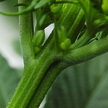 Je begrijpt dus waarom het belangrijk is om mannelijke bloemen te herkennen, vóórdat ze hun stuifmeel loslaten. Kijk hiervoor aan het begin van de bloeifase goed naar de nodes, want daar laat een wietplant voor het eerst zijn of haar geslacht zien. Een node is de plaats op een tak of op de hoofdstam van waaruit schutbladeren en zijtakken groeien.
