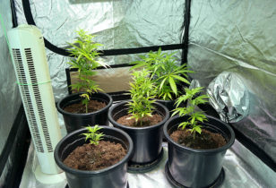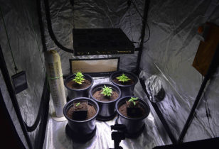 Wietkweker Barney verpot drie van zijn vijf wietplanten, verwent ze met wat vitaliserende silicium en zet ze onder de binnenzon van Budmaster.