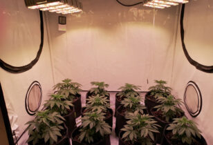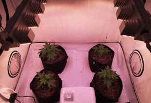 Een nieuwe kweek, een nieuwe wietsoort: deze keer staan er acht mooie paarse Banana Krumble wietplanten onder Bio Bertjes SANlights.