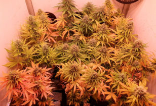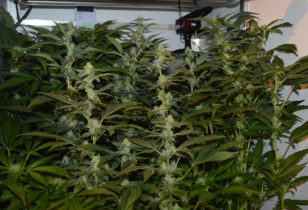 Bloeiweek #3: de toppen van de 24k Gold wietplanten beginnen al te plakken. Dokter Groen moet wéér ontbladeren en doet de nodige hoogtebeperking.