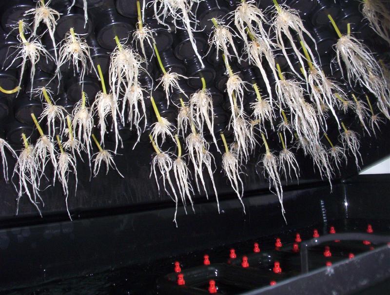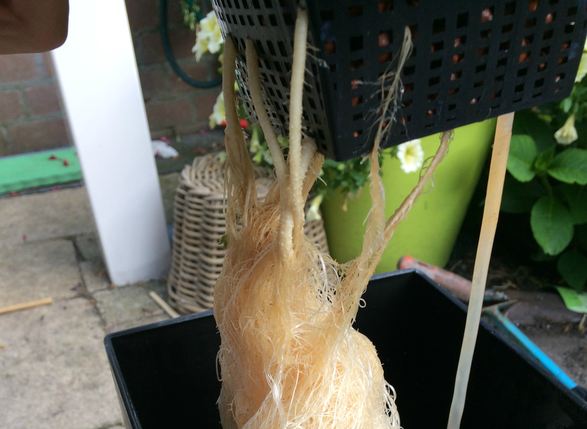 De kweek van Power Plant Jose in de bubble bucket gaat perfect. De plant heeft al toppen en het systeem is een succes