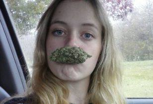 Peggy maakte van haar Ironman-masker een persoonlijke hotbox om knetterstoned in te worden