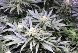 De andere gefimmede White Widow bloeit ook lekker door, maar neemt wat langer de tijd. Deze plant heeft sneeuw en min -9 graden doorgemaakt afgelopen voorjaar, ze staat in een wat kleinere pot en heeft slechts 3 vingerige bladeren. Ik vind het maar een lelijke plant, maar haar toppen ruiken heerlijk fris een beetje naar citroen en mint.