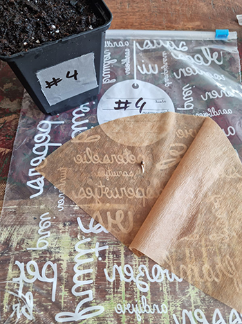 Update 28 april 2022: Helaas heeft zaadje nummer 1 het niet gered. De andere vier waren binnen 2 dagen zover om in een potje te gaan. Ik ben nummer 1 elke dag gecheckt maar nog steeds niet ontkiemt. Ik ga er niet meer vanuit dat het nog iets wordt. De rest staat lekker tussen hun iets oudere zussen. Overdag in de kas, ’s nachts nog even binnen. Groetjes, Selma en de meiden